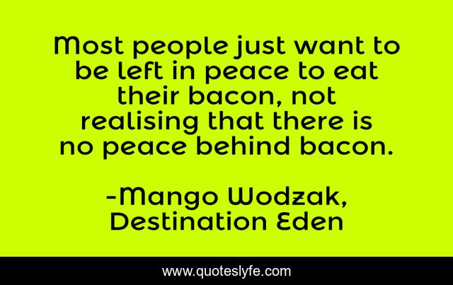 This page presents the quote "Most people just want to be left in peace to eat their bacon, not realising that there is no peace behind bacon.". Author of this quote is Mango Wodzak, Destination Eden. This quote is about love, compassion, peace, bacon, vegan, veganism, affection,.