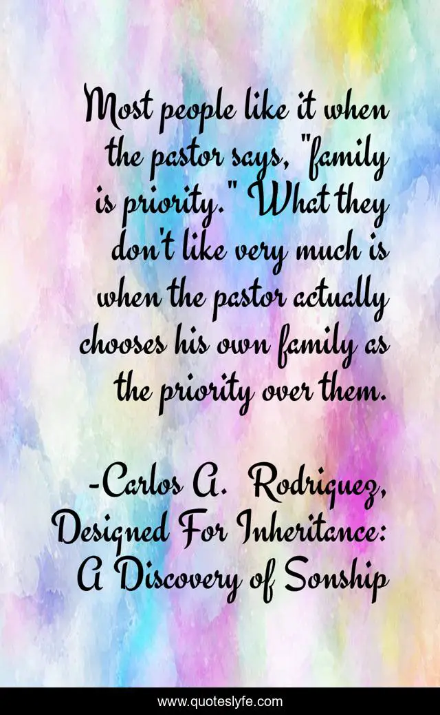 This page presents the quote "Most people like it when the pastor says, "family is priority." What they don't like very much is when the pastor actually chooses his own family as the priority over them.". Author of this quote is Carlos A. Rodriguez, Designed For Inheritance: A Discovery of Sonship. This quote is about relationships, love, family, ministry, god, priorities, jesus, forgiveness, affection,.