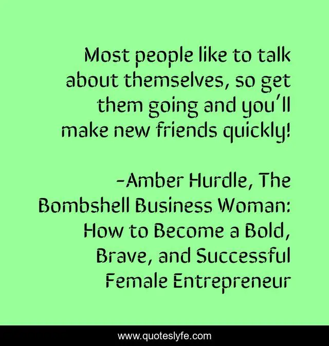 This page presents the quote "Most people like to talk about themselves, so get them going and you’ll make new friends quickly!". Author of this quote is Amber Hurdle, The Bombshell Business Woman: How to Become a Bold, Brave, and Successful Female Entrepreneur. This quote is about wealth, wisdom,.