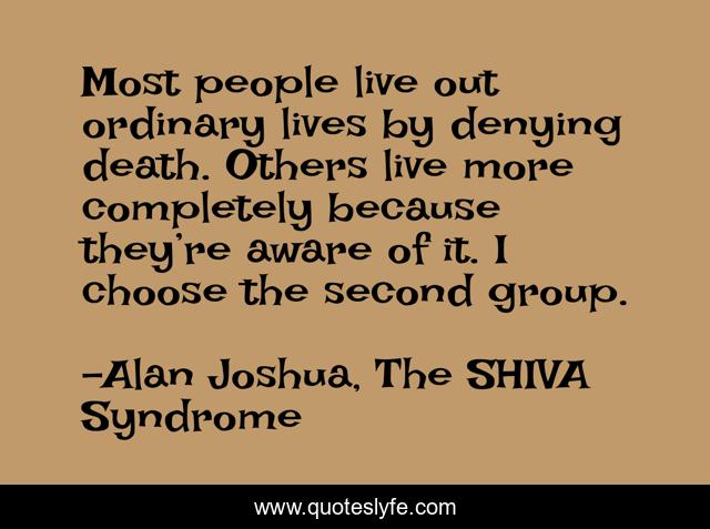 This page presents the quote "Most people live out ordinary lives by denying death. Others live more completely because they’re aware of it. I choose the second group.". Author of this quote is Alan Joshua, The SHIVA Syndrome. This quote is about philosophy-of-life, science-fiction,.
