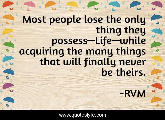 This page presents the quote "Most people lose the only thing they possess—Life—while acquiring the many things that will finally never be theirs.". Author of this quote is RVM. This quote is about motivation, inspiration,.