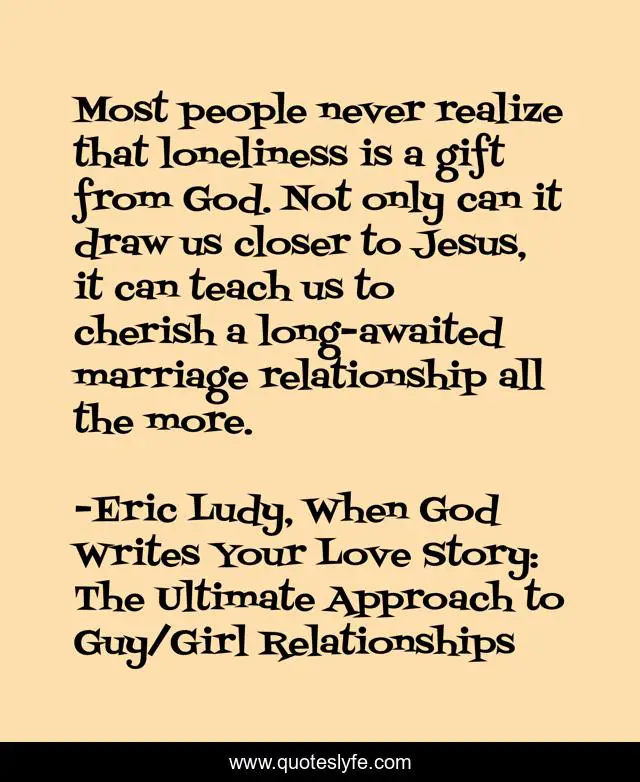This page presents the quote "Most people never realize that loneliness is a gift from God. Not only can it draw us closer to Jesus, it can teach us to cherish a long-awaited marriage relationship all the more.". Author of this quote is Eric Ludy, When God Writes Your Love Story: The Ultimate Approach to Guy/Girl Relationships. This quote is about loneliness, waiting-on-god,.