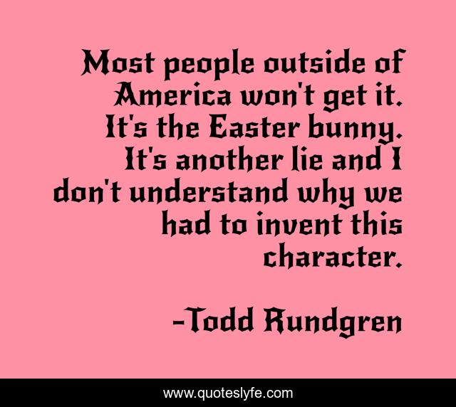This page presents the quote "Most people outside of America won't get it. It's the Easter bunny. It's another lie and I don't understand why we had to invent this character.". Author of this quote is Todd Rundgren. This quote is about lie, america, character,.