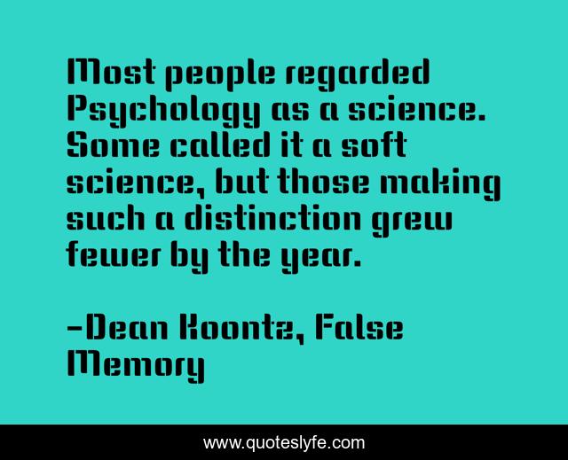 This page presents the quote "Most people regarded Psychology as a science. Some called it a soft science, but those making such a distinction grew fewer by the year.". Author of this quote is Dean Koontz, False Memory. This quote is about science, psychology, soft-sciences,.