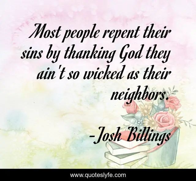 This page presents the quote "Most people repent their sins by thanking God they ain't so wicked as their neighbors.". Author of this quote is Josh Billings. This quote is about neighbors, god, people,.