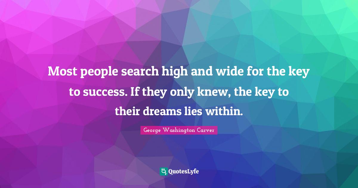 This page presents the quote "Most people search high and wide for the key to success. If they only knew, the key to their dreams lies within.". Author of this quote is George Washington Carver. This quote is about dream, key to success, teaching, people, wide, lying,.