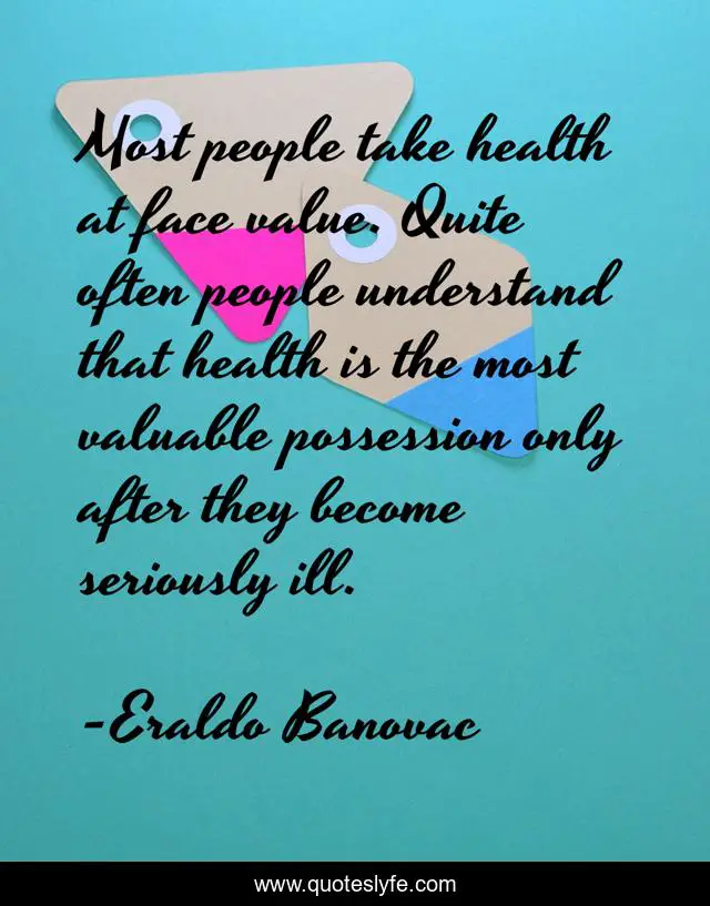 This page presents the quote "Most people take health at face value. Quite often people understand that health is the most valuable possession only after they become seriously ill.". Author of this quote is Eraldo Banovac. This quote is about possession, illness, philosophy, sociology, health, philosophy-of-life,.