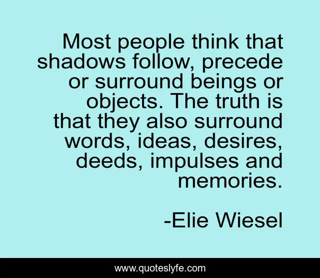 This page presents the quote "Most people think that shadows follow, precede or surround beings or objects. The truth is that they also surround words, ideas, desires, deeds, impulses and memories.". Author of this quote is Elie Wiesel. This quote is about memories, ideas, words,.