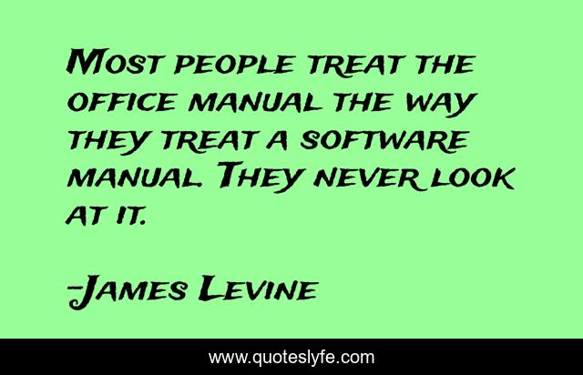 This page presents the quote "Most people treat the office manual the way they treat a software manual. They never look at it.". Author of this quote is James Levine. This quote is about people, treat, software,.