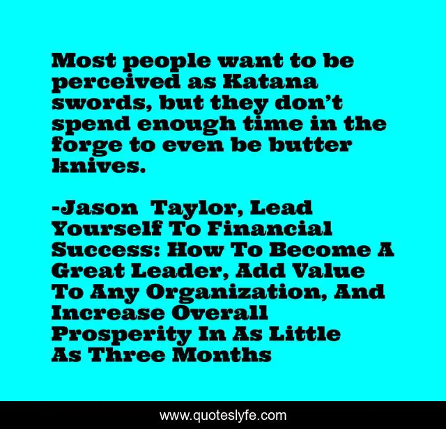 This page presents the quote "Most people want to be perceived as Katana swords, but they don’t spend enough time in the forge to even be butter knives.". Author of this quote is Jason Taylor, Lead Yourself To Financial Success: How To Become A Great Leader, Add Value To Any Organization, And Increase Overall Prosperity In As Little As Three Months. This quote is about positive, confidence, motivational, optimistic,.