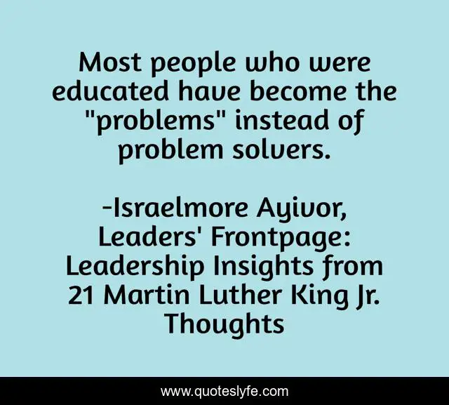This page presents the quote "Most people who were educated have become the "problems" instead of problem solvers.". Author of this quote is Israelmore Ayivor, Leaders' Frontpage: Leadership Insights from 21 Martin Luther King Jr. Thoughts. This quote is about college, food-for-thought, educated, leaders, martin-luther-king-jr, university, problems, martin-luther-king, leadership,.