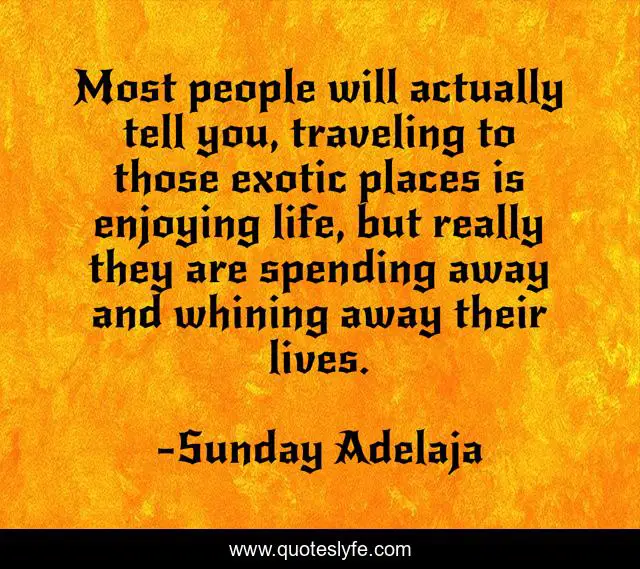This page presents the quote "Most people will actually tell you, traveling to those exotic places is enjoying life, but really they are spending away and whining away their lives.". Author of this quote is Sunday Adelaja. This quote is about life, whining, people, actually, lives, enjoying, really,.