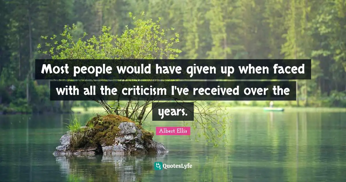 This page presents the quote "Most people would have given up when faced with all the criticism I've received over the years.". Author of this quote is Albert Ellis. This quote is about people, criticism, given up, years,.