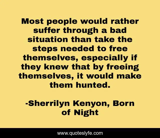 This page presents the quote "Most people would rather suffer through a bad situation than take the steps needed to free themselves, especially if they knew that by freeing themselves, it would make them hunted.". Author of this quote is Sherrilyn Kenyon, Born of Night. This quote is about romance, suffering, scifi,.