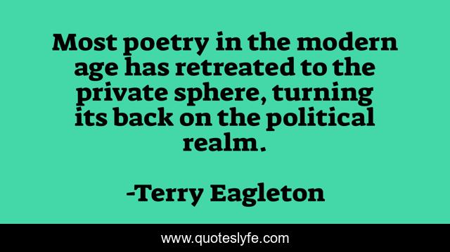This page presents the quote "Most poetry in the modern age has retreated to the private sphere, turning its back on the political realm.". Author of this quote is Terry Eagleton. This quote is about age, political, back,.
