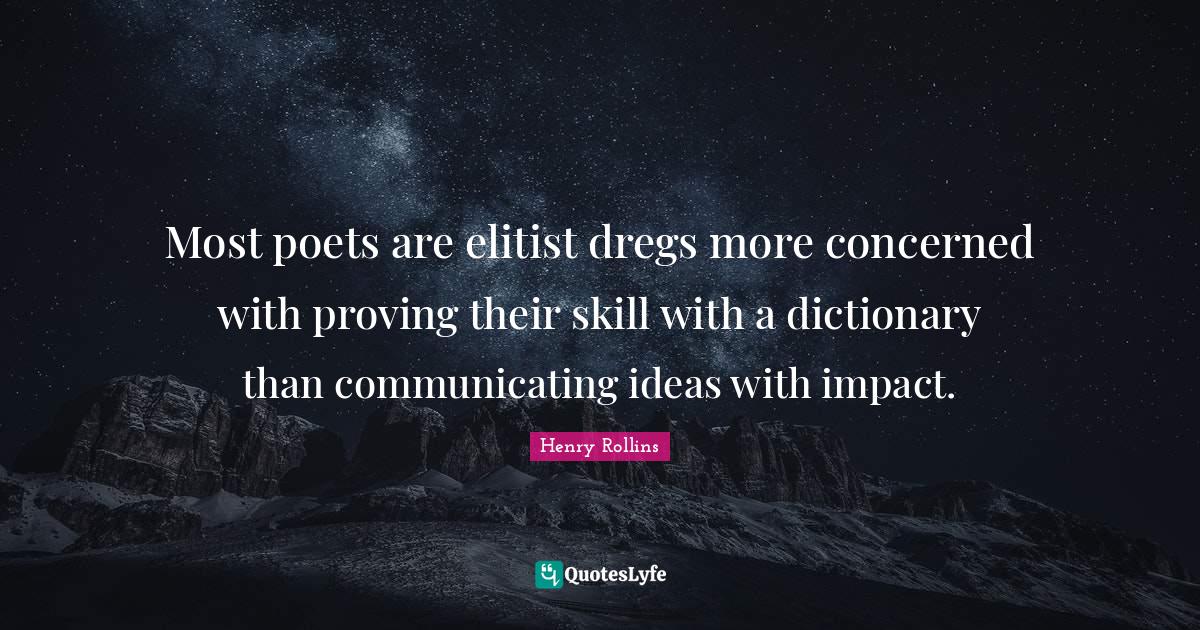 This page presents the quote "Most poets are elitist dregs more concerned with proving their skill with a dictionary than communicating ideas with impact.". Author of this quote is Henry Rollins. This quote is about dictionary, dregs, concerned, elitist, impact, skills, ideas,.