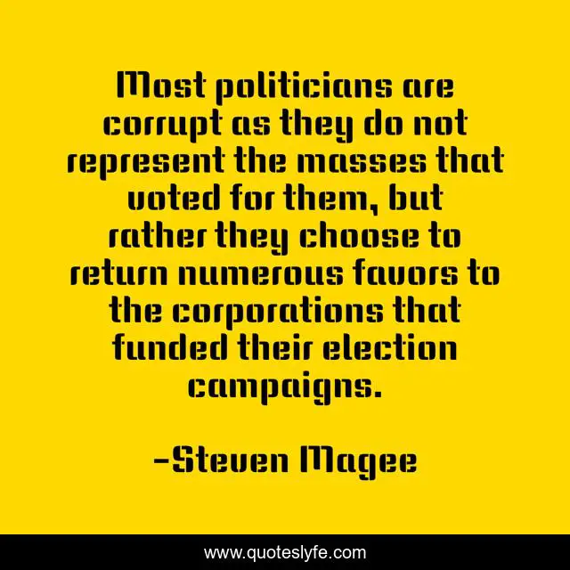 "Steven Magee Quotes." Quoteslyfe.com, 2025. Mon. 08 Dec. 2025. <https://www.quoteslyfe.com/quote/Most-politicians-are-corrupt-as-they-do-57439>.