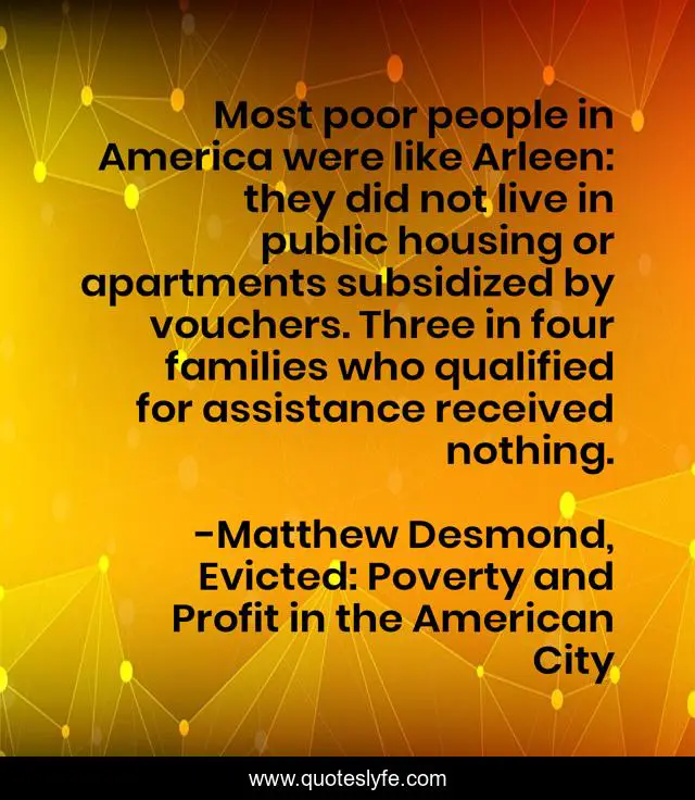 This page presents the quote "Most poor people in America were like Arleen: they did not live in public housing or apartments subsidized by vouchers. Three in four families who qualified for assistance received nothing.". Author of this quote is Matthew Desmond, Evicted: Poverty and Profit in the American City. This quote is about housing, poverty, public-housing,.