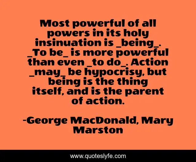 This page presents the quote "Most powerful of all powers in its holy insinuation is _being_. _To be_ is more powerful than even _to do_. Action _may_ be hypocrisy, but being is the thing itself, and is the parent of action.". Author of this quote is George MacDonald, Mary Marston. This quote is about action, being, to-be, to-do,.