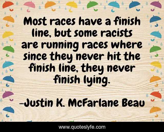 This page presents the quote "Most races have a finish line, but some racists are running races where since they never hit the finish line, they never finish lying.". Author of this quote is Justin K. McFarlane Beau. This quote is about bigots, racists, despots, finish-line, race, fools, lying,.