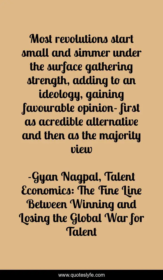 "Gyan Nagpal, Talent Economics: The Fine Line Between Winning and Losing the Global War for Talent Quotes." Quoteslyfe.com, 2025. Mon. 08 Dec. 2025. <https://www.quoteslyfe.com/quote/Most-revolutions-start-small-and-simmer-under-140087>.