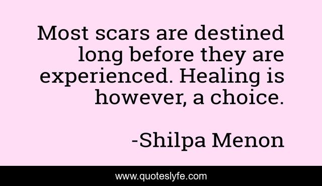 This page presents the quote "Most scars are destined long before they are experienced. Healing is however, a choice.". Author of this quote is Shilpa Menon. This quote is about healing, hope,.
