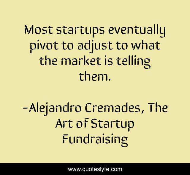 This page presents the quote "Most startups eventually pivot to adjust to what the market is telling them.". Author of this quote is Alejandro Cremades, The Art of Startup Fundraising. This quote is about startup-fundraising, business, entrepreneurship, entrepreneur, entrepreneurial, startups,.