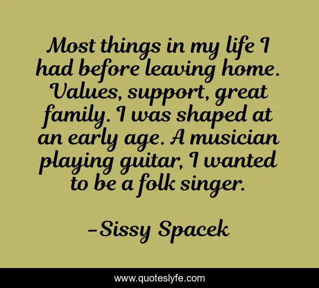 This page presents the quote "Most things in my life I had before leaving home. Values, support, great family. I was shaped at an early age. A musician playing guitar, I wanted to be a folk singer.". Author of this quote is Sissy Spacek. This quote is about home, life, family,.