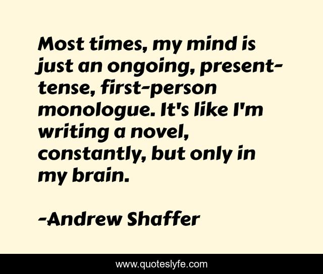 This page presents the quote "Most times, my mind is just an ongoing, present-tense, first-person monologue. It's like I'm writing a novel, constantly, but only in my brain.". Author of this quote is Andrew Shaffer. This quote is about novel, parody, writing,.