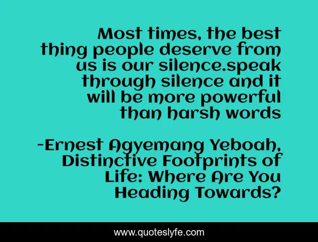This page presents the quote "Most times, the best thing people deserve from us is our silence.speak through silence and it will be more powerful than harsh words". Author of this quote is Ernest Agyemang Yeboah, Distinctive Footprints of Life: Where Are You Heading Towards?. This quote is about silence-speaks, confidence, love, positive, motivational, silence, optimistic, inspirational, enthusiasm,.