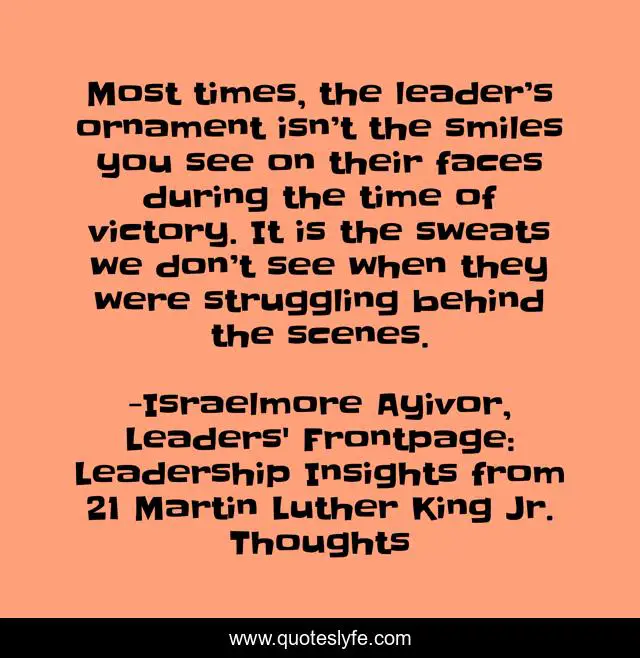 This page presents the quote "Most times, the leader’s ornament isn’t the smiles you see on their faces during the time of victory. It is the sweats we don’t see when they were struggling behind the scenes.". Author of this quote is Israelmore Ayivor, Leaders' Frontpage: Leadership Insights from 21 Martin Luther King Jr. Thoughts. This quote is about leaders, scene, martin-luther-king, happiness, food-for-thought, sweats, hard-work, ornament, struggles,.
