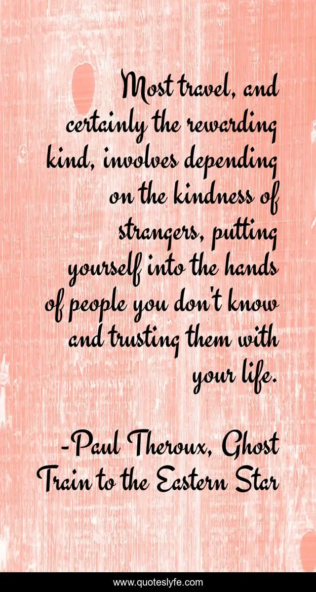 This page presents the quote "Most travel, and certainly the rewarding kind, involves depending on the kindness of strangers, putting yourself into the hands of people you don't know and trusting them with your life.". Author of this quote is Paul Theroux, Ghost Train to the Eastern Star. This quote is about strangers, life, kindness, trust, travel,.