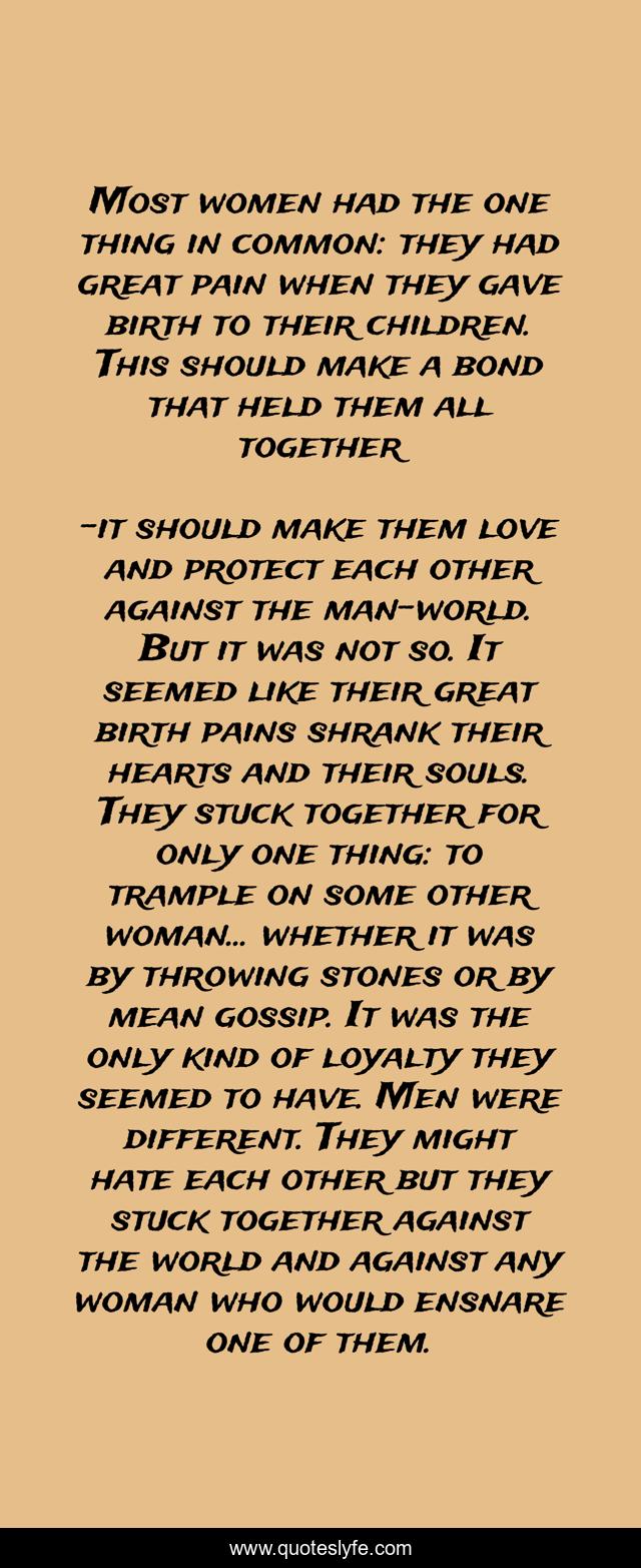 Check all other quotes by it should make them love and protect each other against the man-world. But it was not so. It seemed like their great birth pains shrank their hearts and their souls. They stuck together for only one thing: to trample on some other woman... whether it was by throwing stones or by mean gossip. It was the only kind of loyalty they seemed to have. Men were different. They might hate each other but they stuck together against the world and against any woman who would ensnare one of them.