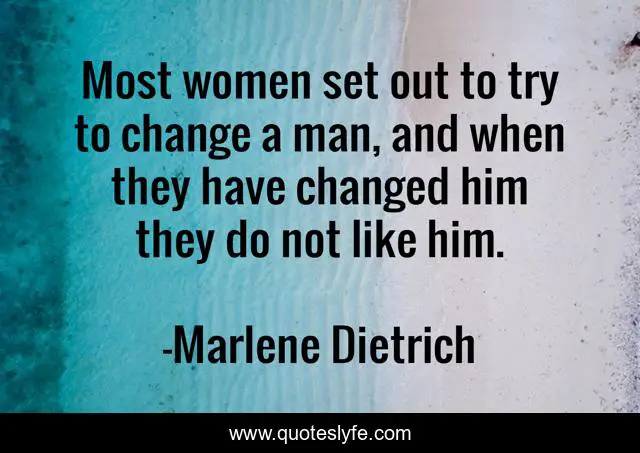 This page presents the quote "Most women set out to try to change a man, and when they have changed him they do not like him.". Author of this quote is Marlene Dietrich. This quote is about try, change, man,.