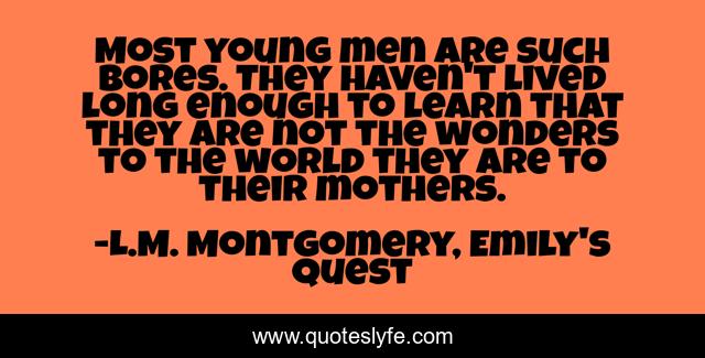 This page presents the quote "Most young men are such bores. They haven't lived long enough to learn that they are not the wonders to the world they are to their mothers.". Author of this quote is L.M. Montgomery, Emily's Quest. This quote is about boys, sons, mothers-and-sons, young-men, mothers,.