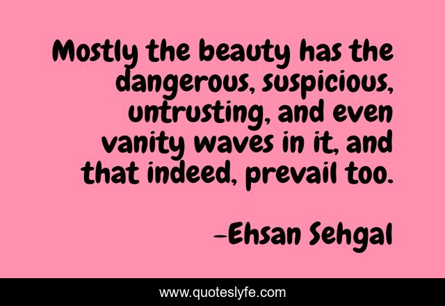 This page presents the quote "Mostly the beauty has the dangerous, suspicious, untrusting, and even vanity waves in it, and that indeed, prevail too.". Author of this quote is Ehsan Sehgal. .