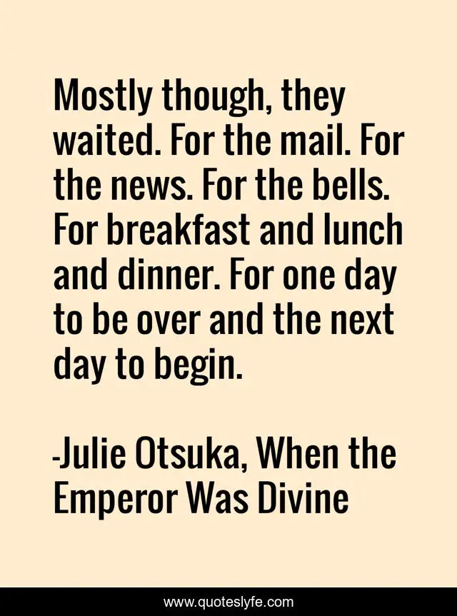 This page presents the quote "Mostly though, they waited. For the mail. For the news. For the bells. For breakfast and lunch and dinner. For one day to be over and the next day to begin.". Author of this quote is Julie Otsuka, When the Emperor Was Divine. This quote is about thought-provoking, history,.