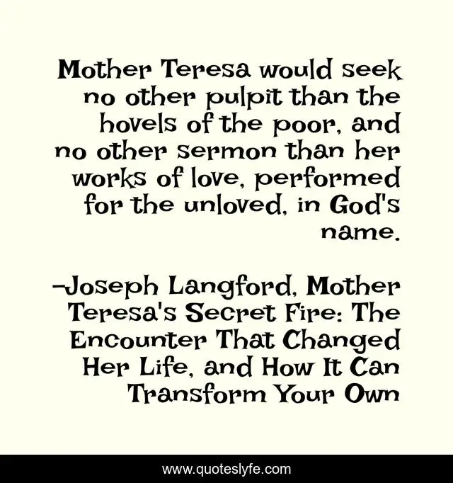 This page presents the quote "Mother Teresa would seek no other pulpit than the hovels of the poor, and no other sermon than her works of love, performed for the unloved, in God's name.". Author of this quote is Joseph Langford, Mother Teresa's Secret Fire: The Encounter That Changed Her Life, and How It Can Transform Your Own. .