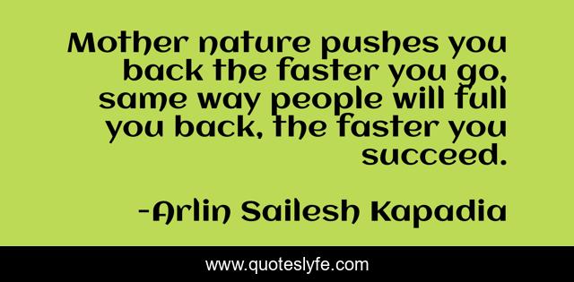 This page presents the quote "Mother nature pushes you back the faster you go, same way people will full you back, the faster you succeed.". Author of this quote is Arlin Sailesh Kapadia. This quote is about pull, life, success, nature, philosophy, succeed, mother, push,.
