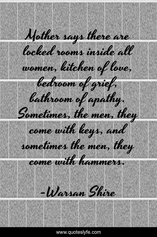 This page presents the quote "Mother says there are locked rooms inside all women, kitchen of love, bedroom of grief, bathroom of apathy. Sometimes, the men, they come with keys, and sometimes the men, they come with hammers.". Author of this quote is Warsan Shire. This quote is about apathy, love, men, grief, affection, women,.