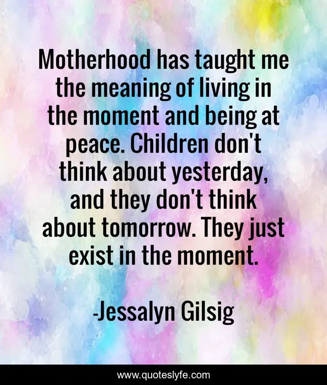 This page presents the quote "Motherhood has taught me the meaning of living in the moment and being at peace. Children don't think about yesterday, and they don't think about tomorrow. They just exist in the moment.". Author of this quote is Jessalyn Gilsig. This quote is about motherhood, children,.