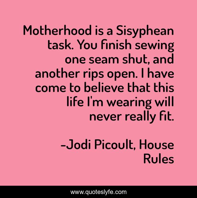 This page presents the quote "Motherhood is a Sisyphean task. You finish sewing one seam shut, and another rips open. I have come to believe that this life I'm wearing will never really fit.". Author of this quote is Jodi Picoult, House Rules. .