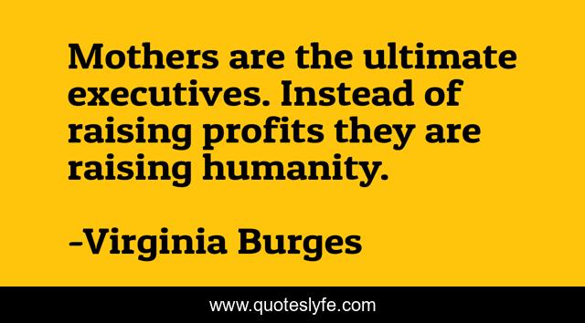 This page presents the quote "Mothers are the ultimate executives. Instead of raising profits they are raising humanity.". Author of this quote is Virginia Burges. This quote is about motherhood, parenting,.
