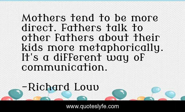 This page presents the quote "Mothers tend to be more direct. Fathers talk to other fathers about their kids more metaphorically. It's a different way of communication.". Author of this quote is Richard Louv. This quote is about kids, way, mothers,.