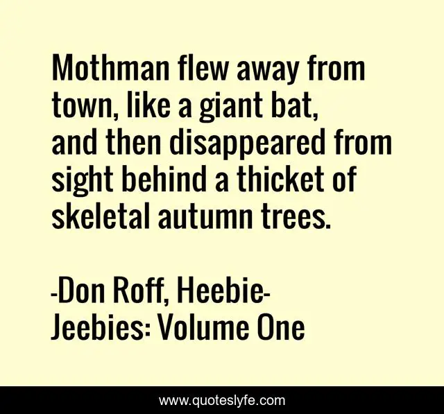 This page presents the quote "Mothman flew away from town, like a giant bat, and then disappeared from sight behind a thicket of skeletal autumn trees.". Author of this quote is Don Roff, Heebie-Jeebies: Volume One. This quote is about autumn, bat, trees, mothman,.