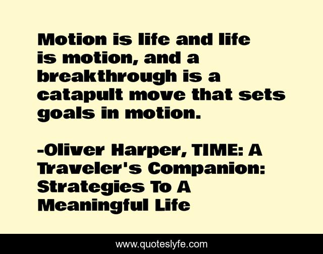This page presents the quote "Motion is life and life is motion, and a breakthrough is a catapult move that sets goals in motion.". Author of this quote is Oliver Harper, TIME: A Traveler's Companion: Strategies To A Meaningful Life. .