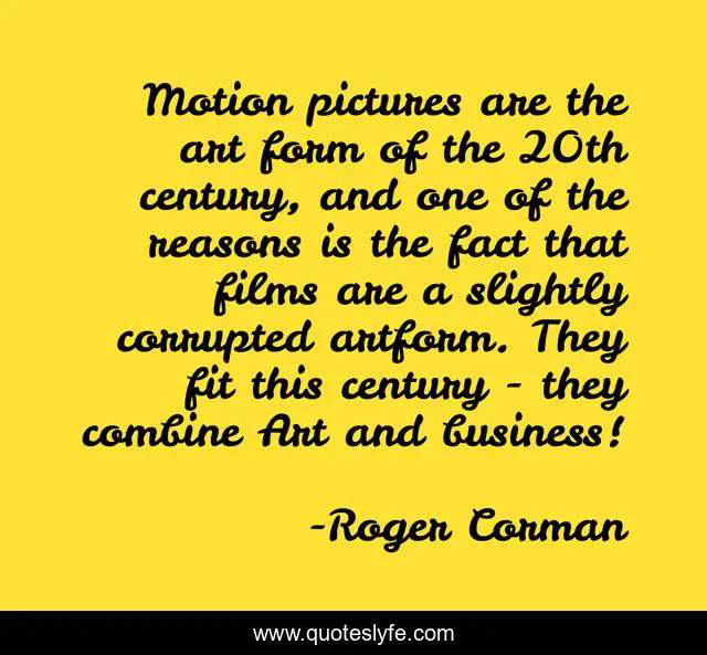 This page presents the quote "Motion pictures are the art form of the 20th century, and one of the reasons is the fact that films are a slightly corrupted artform. They fit this century - they combine Art and business!". Author of this quote is Roger Corman. This quote is about motion, pictures, art,.