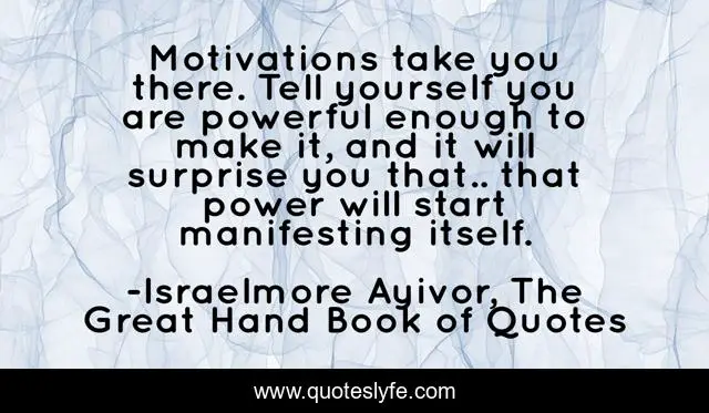 This page presents the quote "Motivations take you there. Tell yourself you are powerful enough to make it, and it will surprise you that.. that power will start manifesting itself.". Author of this quote is Israelmore Ayivor, The Great Hand Book of Quotes. This quote is about motivation, inspire, powerful, begin, enthusiasm, dunamis-power, measure, beyond-measure, food-for-thought,.