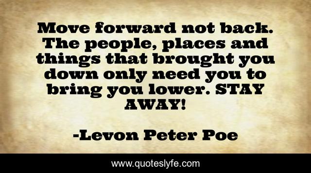 This page presents the quote "Move forward not back. The people, places and things that brought you down only need you to bring you lower. STAY AWAY!". Author of this quote is Levon Peter Poe. .