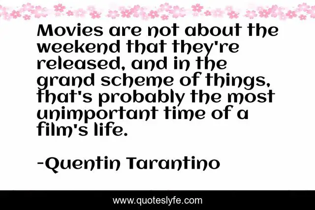 This page presents the quote "Movies are not about the weekend that they're released, and in the grand scheme of things, that's probably the most unimportant time of a film's life.". Author of this quote is Quentin Tarantino. This quote is about life, weekend, time,.